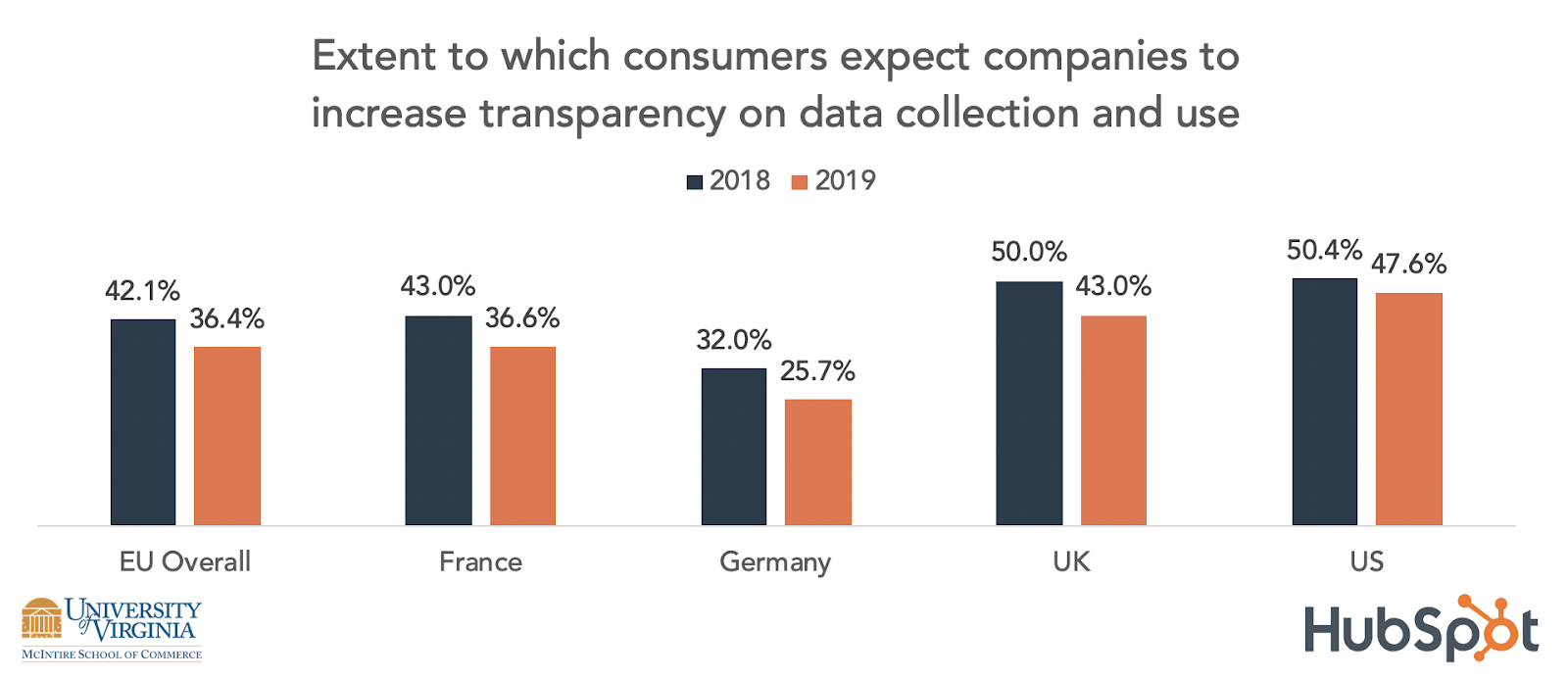 Thêm vào đó, trong khi một trong những nguyên lý chính của GDPR là chiếu sáng tính minh bạch của việc thu thập dữ liệu, số lượng người tiêu dùng trên E.U. và Hoa Kỳ, những người mong đợi sự minh bạch này đã giảm trong năm 2019, so với năm 2018.